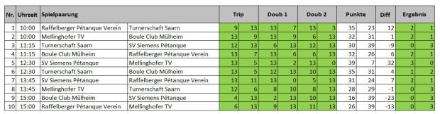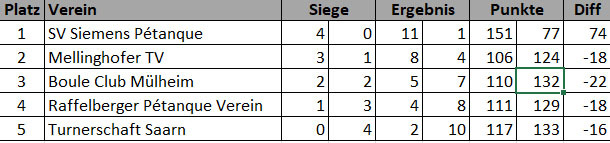 Der TeamCup Pétanque ist ein Mannschaftswettbewerb, an dem sich regelmäßig alle fünf Mülheimer Pétanque Vereine – der Bouleclub Mülheim, der Raffelberger Pétanque Verein, der SV Siemens Pétanque, der Mellinghofer Turnverein MTV und die Turnerschaft Saarn als Ausrichter – beteiligen und in einem abgespeckten Ligamodus den Mülheimer Vereinsmeister ermitteln. Dabei spielt jeder gegen jeden parallel ein Triplette sowie zwei Doublettes. Die Spieldauer einer Begegnung war auf 60 Minuten plus eine Aufnahme begrenzt. Zwei Begegnungen fanden immer zeitgleich auf unseren beiden Boulefeldern statt.