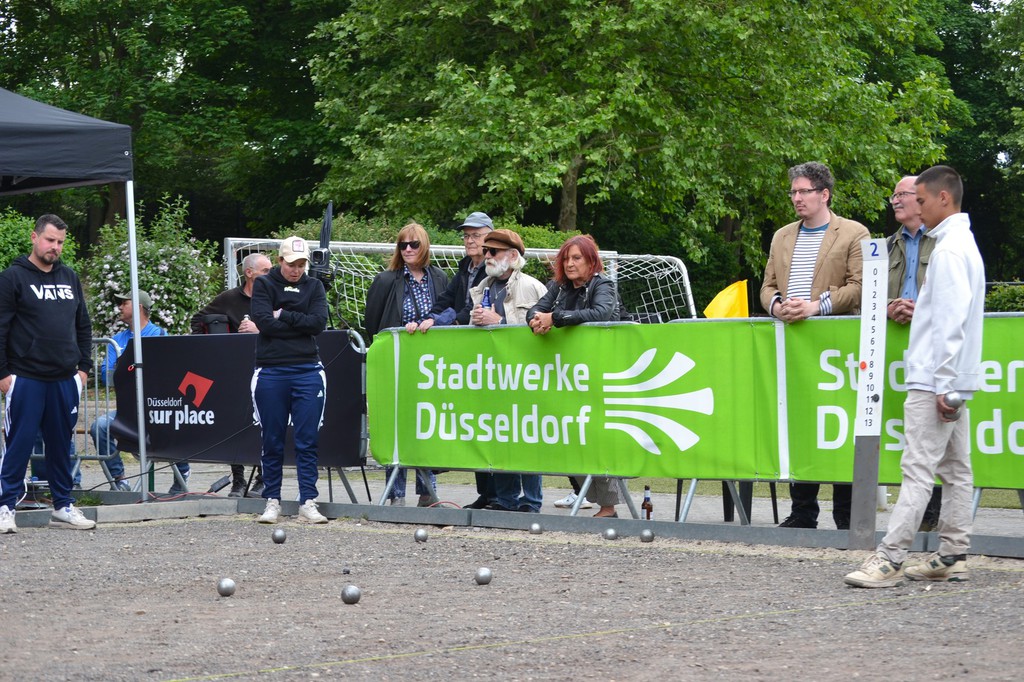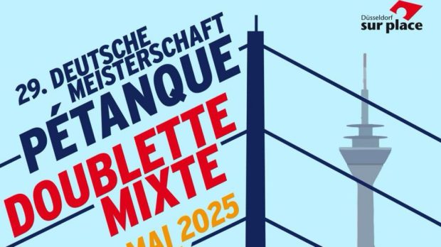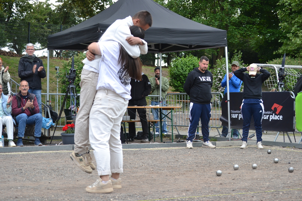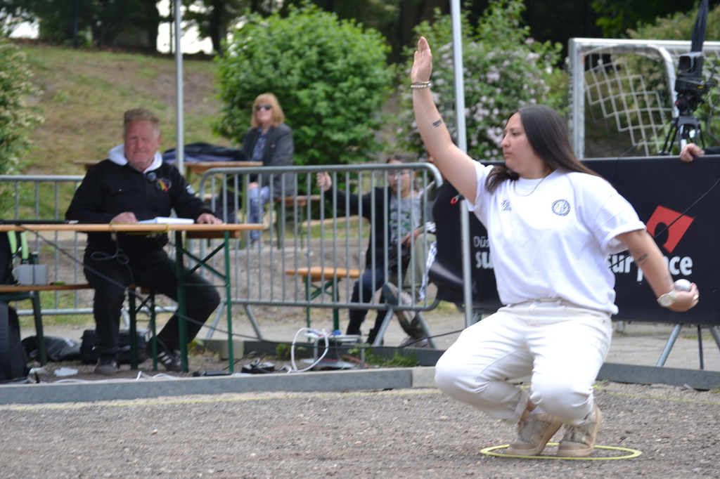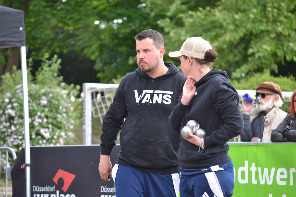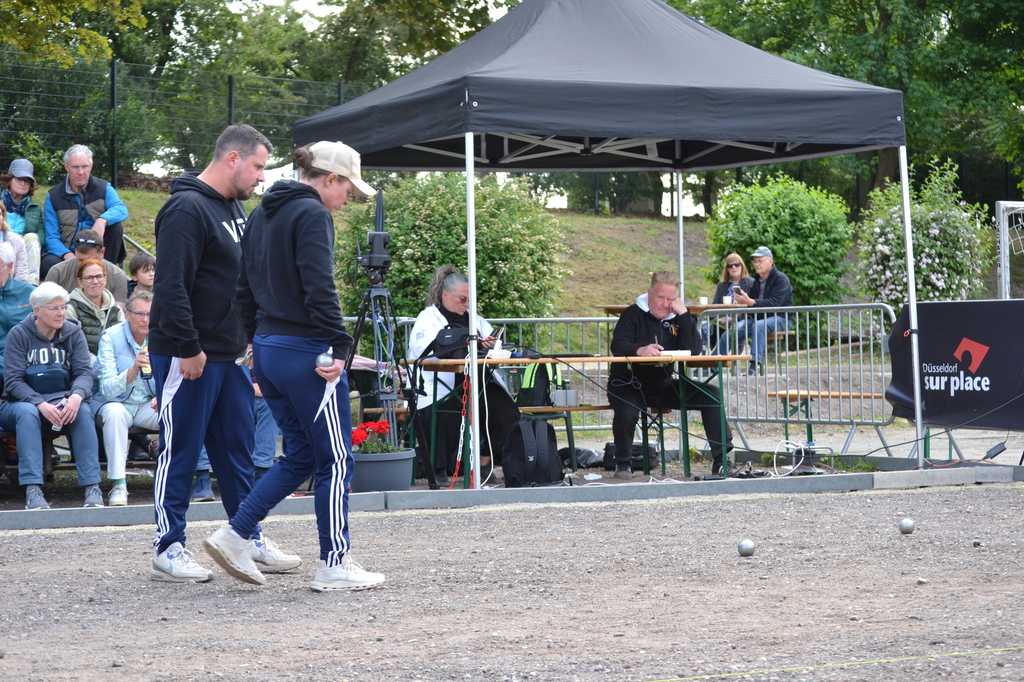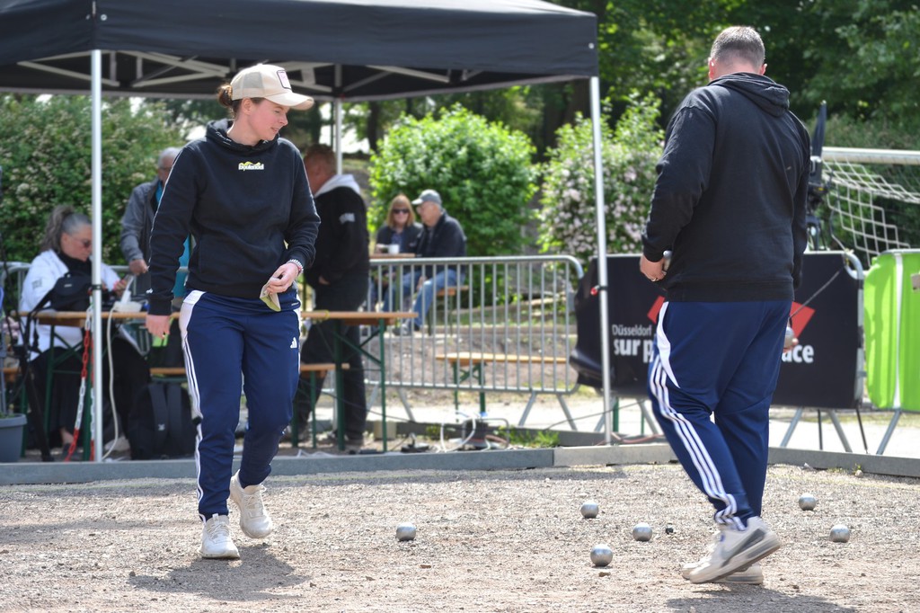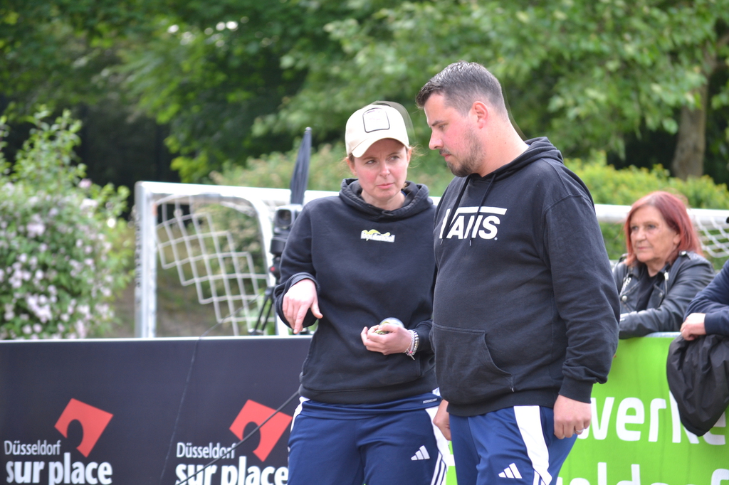 Am Samstag und Sonntag, dem 17./ 18. Mai 2025 fanden in Düsseldorf sur Place, Pariser Str. 45, 40549 Düsseldorf die Deutschen Meisterschaften im Doublette mixte da. 128 Teams nahmen daran teil. Birgit Lübke/ Frank Gutberger (Gelsenkirchen Balistique) hatten die Teilnahme bei der Landesmeisterschaft in Ratingen-Lintorf leider knapp verpasst. Dennoch war dieses Event eine gute Gelegenheit die deutschen Spitzenspieler hautnah zu erleben. So machten sich einige Saarner auf den Weg nach Düsseldorf und erlebten ein spannendes und hochemotionales Finale, dass Eileen Jenal/ Justin Neu (Saar 01) gegen Anna Lazaridis/ André Skoba (BaWü 01) nach hartem Kampf mit 13:8 für sich entscheiden konnten. Dritte der Deutschen Meisterschaften wurden Domino Probst/ Matthias Laukart (BaWü 02) und Kerstin Lisner/ Sylvain Ramon (NRW 22).