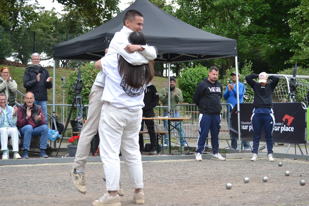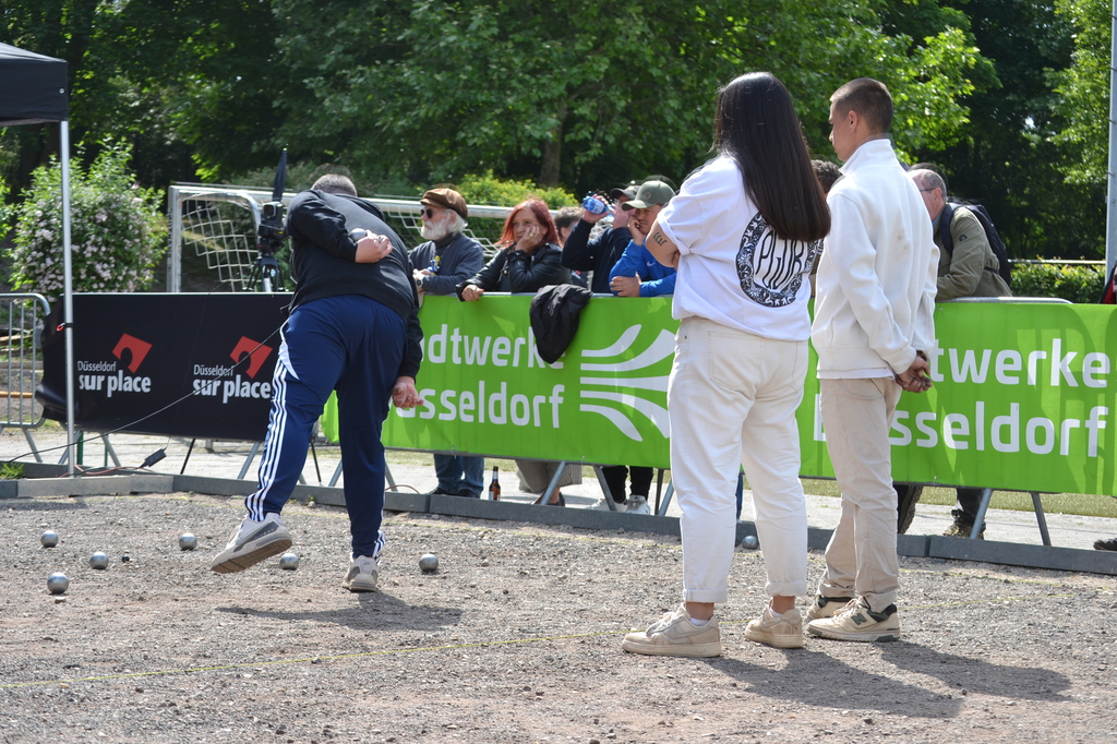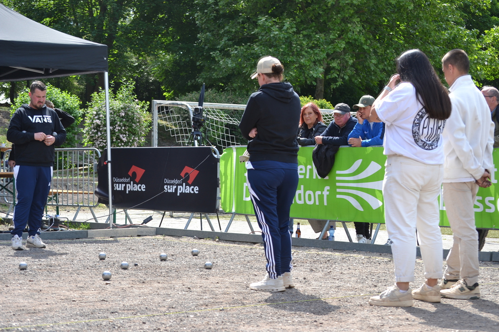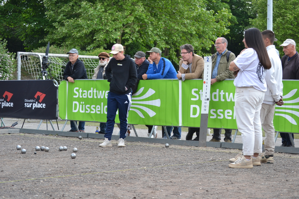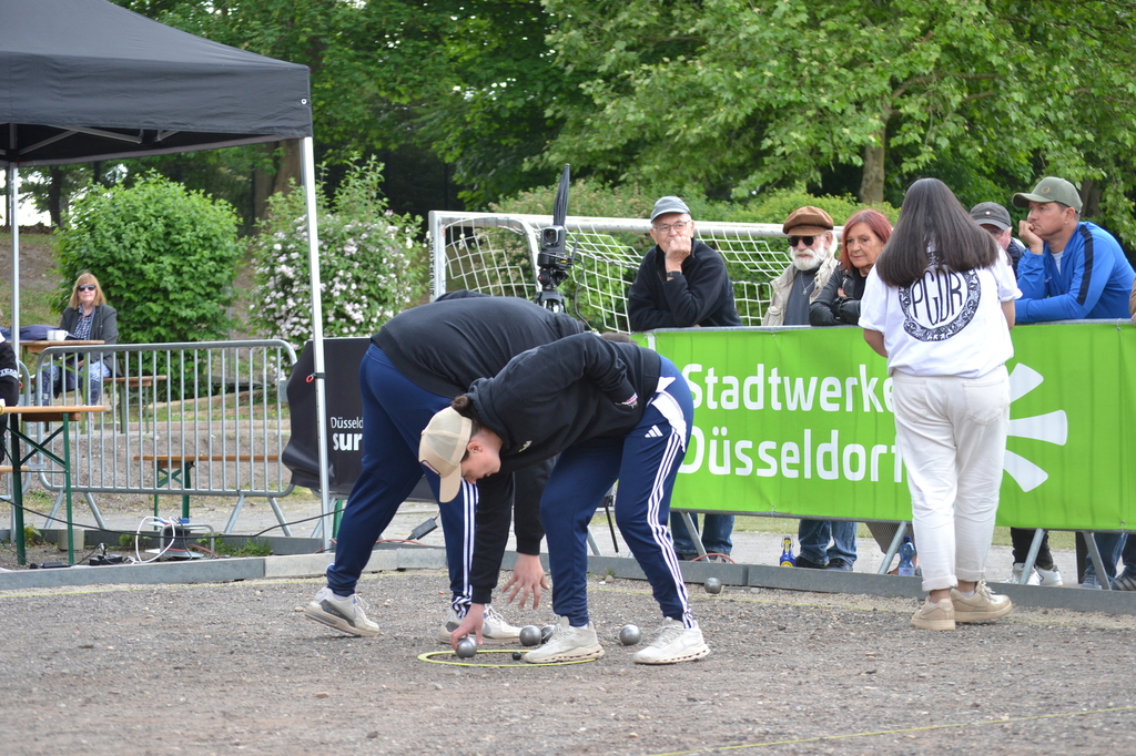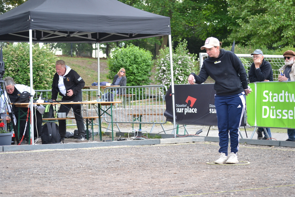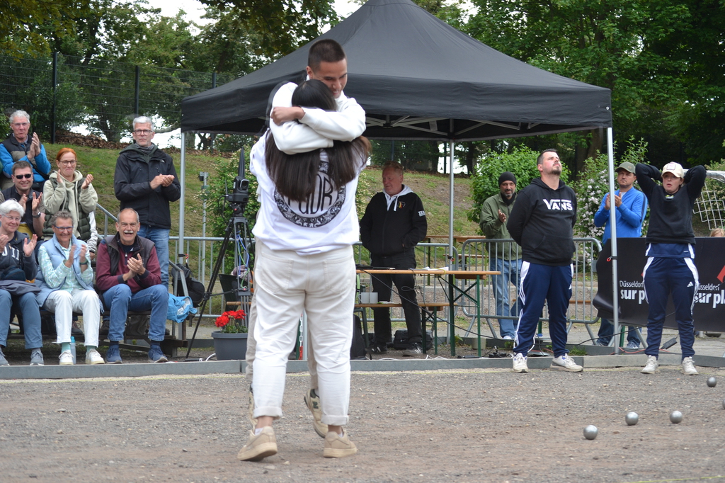 Am Samstag und Sonntag, dem 17./ 18. Mai 2025 fanden in Düsseldorf sur Place, Pariser Str. 45, 40549 Düsseldorf die Deutschen Meisterschaften im Doublette mixte da. 128 Teams nahmen daran teil. Birgit Lübke/ Frank Gutberger (Gelsenkirchen Balistique) hatten die Teilnahme bei der Landesmeisterschaft in Ratingen-Lintorf leider knapp verpasst. Dennoch war dieses Event eine gute Gelegenheit die deutschen Spitzenspieler hautnah zu erleben. So machten sich einige Saarner auf den Weg nach Düsseldorf und erlebten ein spannendes und hochemotionales Finale, dass Eileen Jenal/ Justin Neu (Saar 01) gegen Anna Lazaridis/ André Skoba (BaWü 01) nach hartem Kampf mit 13:8 für sich entscheiden konnten. Dritte der Deutschen Meisterschaften wurden Domino Probst/ Matthias Laukart (BaWü 02) und Kerstin Lisner/ Sylvain Ramon (NRW 22).
