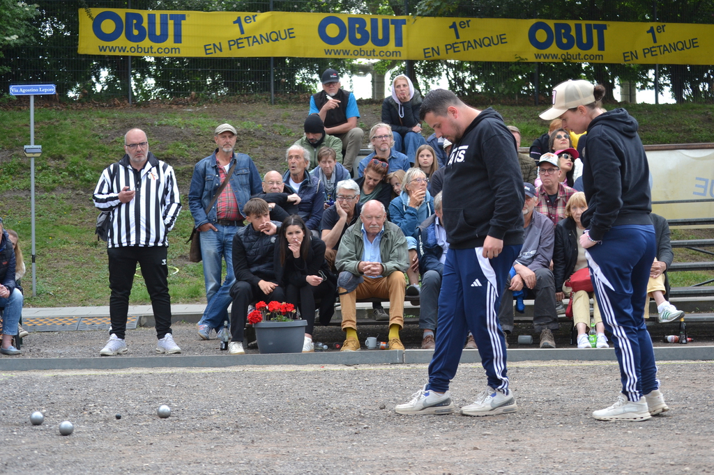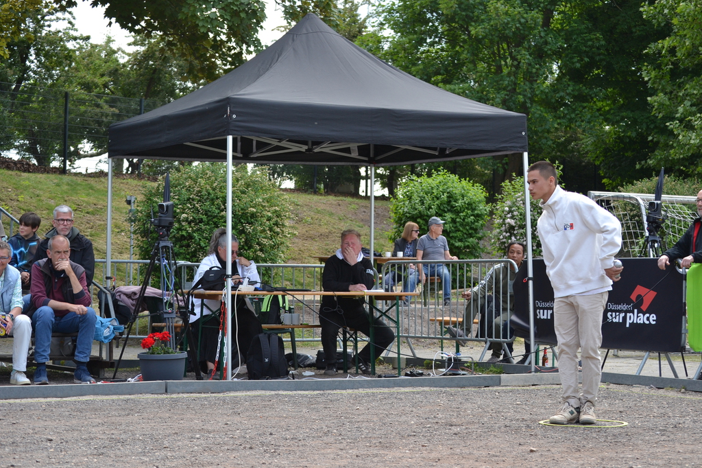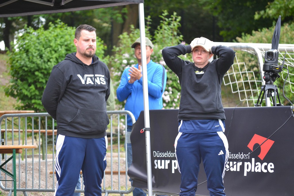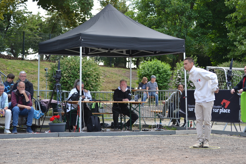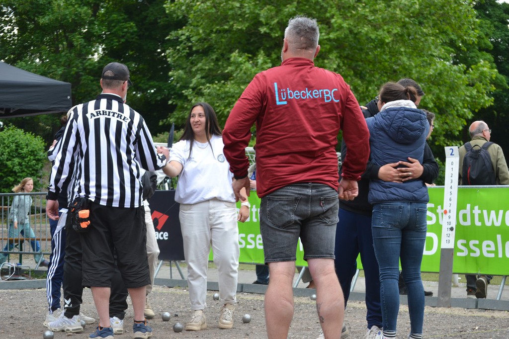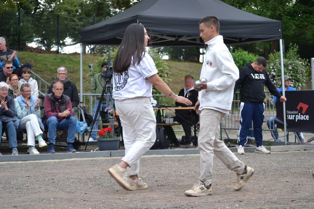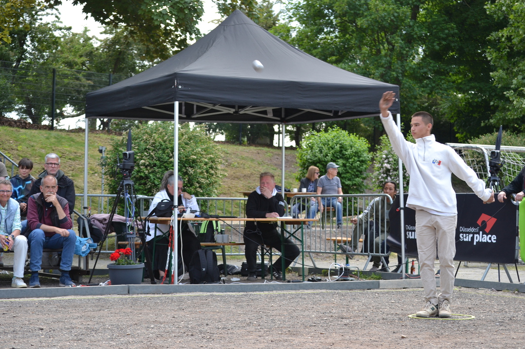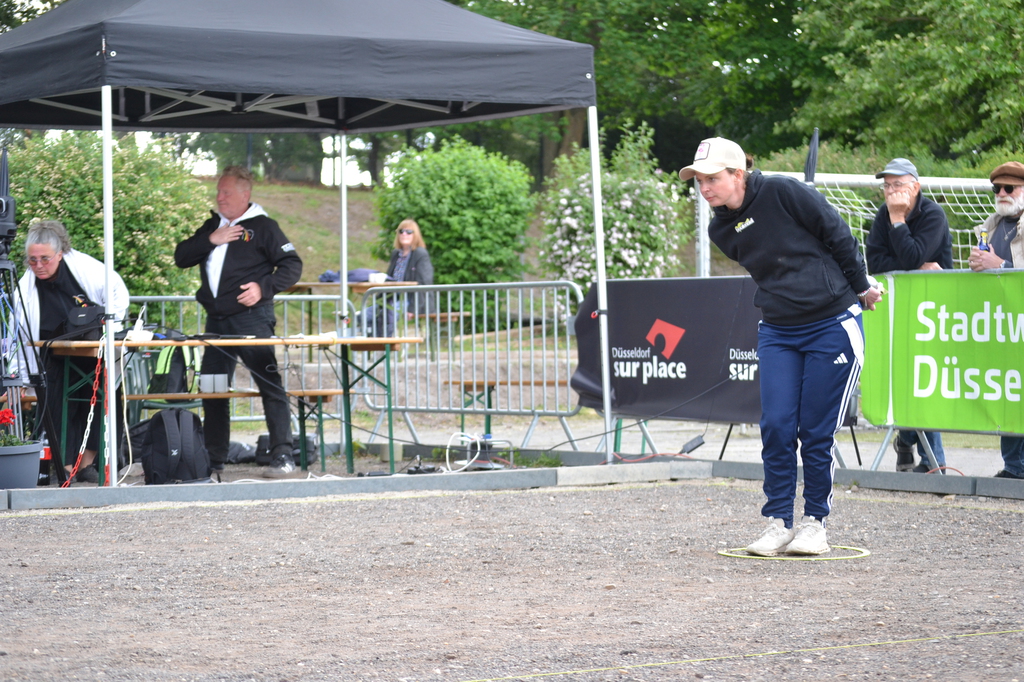 Am Samstag und Sonntag, dem 17./ 18. Mai 2025 fanden in Düsseldorf sur Place, Pariser Str. 45, 40549 Düsseldorf die Deutschen Meisterschaften im Doublette mixte da. 128 Teams nahmen daran teil. Birgit Lübke/ Frank Gutberger (Gelsenkirchen Balistique) hatten die Teilnahme bei der Landesmeisterschaft in Ratingen-Lintorf leider knapp verpasst. Dennoch war dieses Event eine gute Gelegenheit die deutschen Spitzenspieler hautnah zu erleben. So machten sich einige Saarner auf den Weg nach Düsseldorf und erlebten ein spannendes und hochemotionales Finale, dass Eileen Jenal/ Justin Neu (Saar 01) gegen Anna Lazaridis/ André Skoba (BaWü 01) nach hartem Kampf mit 13:8 für sich entscheiden konnten. Dritte der Deutschen Meisterschaften wurden Domino Probst/ Matthias Laukart (BaWü 02) und Kerstin Lisner/ Sylvain Ramon (NRW 22).