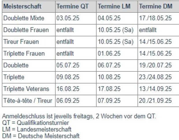 Die Landesmeisterschaften Triplette Veterans findet am Sonntag, dem 17. August 2025 in Köln PCC statt. Mit Birgit Lübke/ Britt Ullrich (Bochum Diaboulo)/ Angelo Evangelio (Gelsenkirchen Balistique), Petra Droll/ Ralf Moritz/ Thomas Dinkelbach und Martina Reh/ Richard Krajewski/ Rainer Engler sind drei Saarner Teams dabei. Gespielt werden 6 Runden á 75 Minuten plus 2 Aufnahmen.