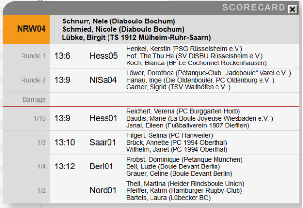 Am 13./ 14. September 2025 findet in Berlin-Tegel die Deutsche Meisterschaft im Triplette Veterans statt. Birgit Lübke/ Britt Ullrich (Bochum Diaboulo)/ Angelo Evangelio (Gelsenkirchen Balitique) starteten als NRW13 und erreichten das 16-tel-Finale.