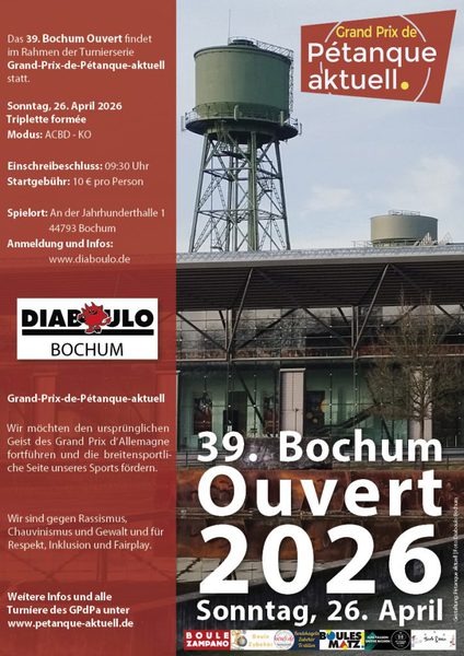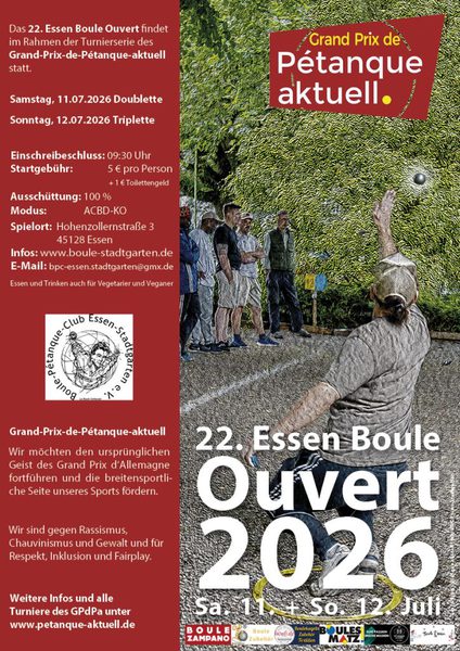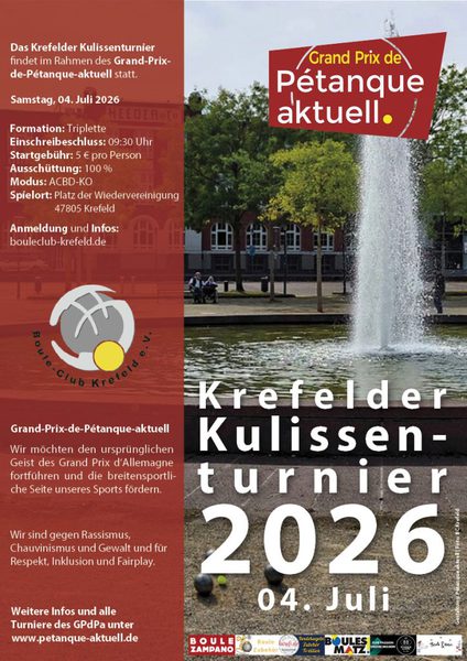 Die Mülheimer Stadtmeisterschaft im Doublette formée findet am Samstag, dem 12. September 2026, beim Boule Club Mülheim statt.