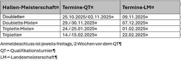 Die Termine für die Meisterschaften könnt ihr der folgenden Tabelle entnehmen.