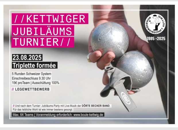 Am Samstag, dem 23. August 2025 fand zum 40-jährigen Bestehen der Boulegemeinschaft Kettwig ein Jubiläumsturnier im Triplette formée statt. Gespielt wurden 5 Runden nach Schweizer System. Die Teilnehmerzahl war auf 64 Teams begrenzt. 53 Teams traten an. Die Startgebühr betrug 15 Euro pro Team, die zu 100% an die siegreichen Teams ausgeschüttet wurden. Anmeldungen waren ab dem 16. Februar 2025 auf der Kettwiger Internetseite möglich. Als Team mit Saarner Beteiligung waren nur Johannes Wolbeck/ Wilhelm Jansen/ Ulriche Pernecker (beide Essen-Kettwig) beteiligt. Das Finale gewannen die Niederländer Ad Wagenaars/ Dennis Bakker/ Guus Vonck, die in einem spannenden Endspiel Ekk Wittchow/ Andre Hensing/ Söhnke Looschen mit 13:12 besiegten. Das Team mit Saarner Beteligung wurde - sieggleich mit dem zehnten Platz - 26ter.
