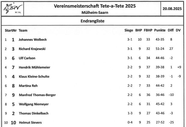 Am Mittwoch, dem 20. August 2025 fand ab 17 Uhr auf besonderen Wunsch vieler Spieler unseres Vereins wieder eine Vereinsmeisterschaft im Tête-à-Tête (Einzel) statt. Gespielt wurden 4 Runden nach Schweizer System á 60 Minuten plus 1 Aufnahme.