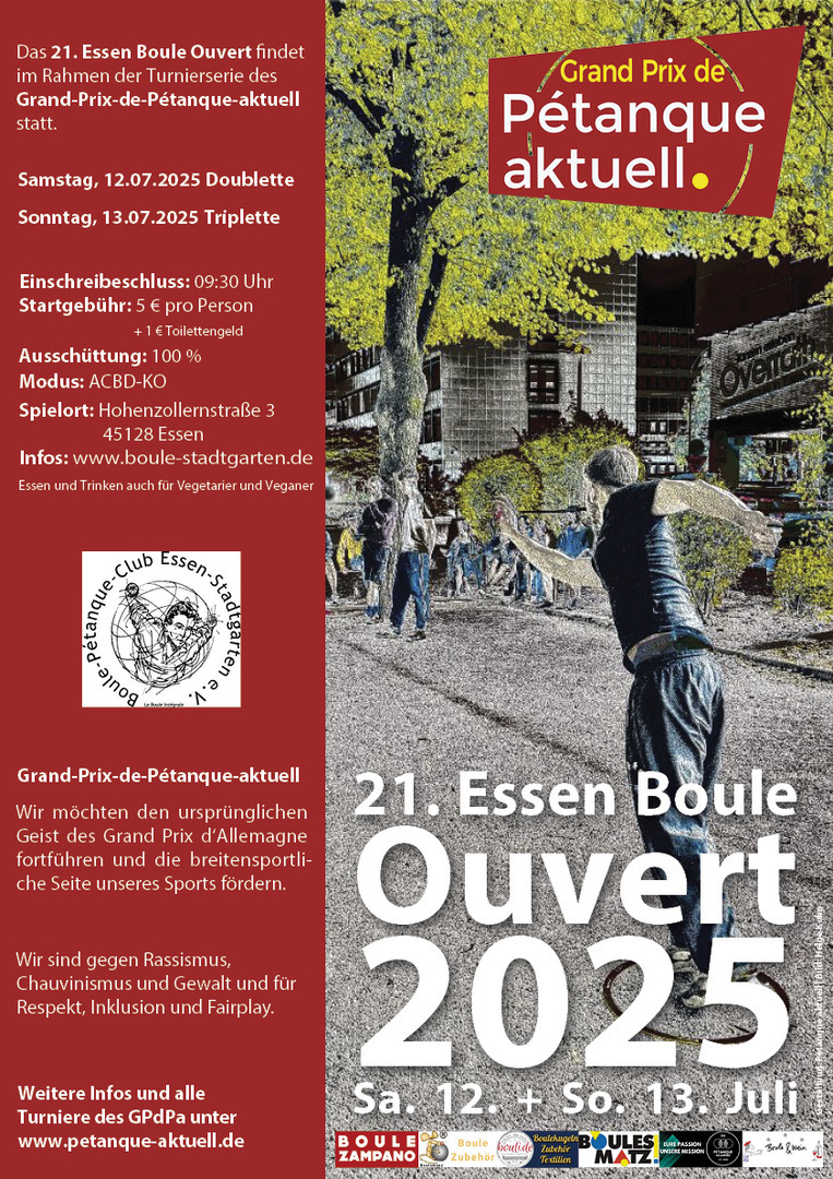 Am 12. und 13. Juli 2025 fand das 21. Essen Boule Ouvert in Essen-Stadtgarten statt. Gespielt wurden 2 Vorrunden und 1 Cadrage. Dann geht es im A/B/C/D KO-Modus weiter. Das Startgeld pro Person betrug 5 Euro bei 100% Ausschüttung plus 1 Euro Toilettengeld. Das Spielgelände war direkt am Contipark Parkplatz, Admiral-Scheer-Straße, 45128 Essen.